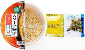 付属品 液体スープ、かやく(キャベツ・肉そぼろ・とうもろこし・ねぎ・わかめフレーク)