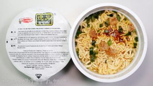 麺は幅2.5mmの扁平で、角は軽く丸められておりふくよかな舌触りです。軽い気泡感がある一方で、澱粉添加っぽい弾力感が強めで、歯応えは締まりがない印象です。それでも日本の安い縦型カップ麺と比べ、同等以上の質感を持っています。