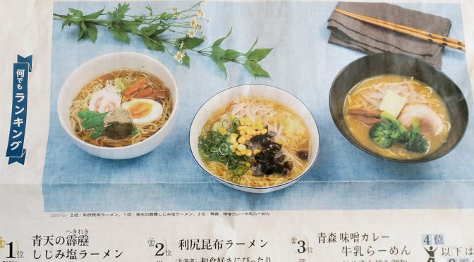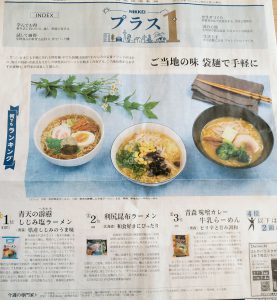 今日(2月21日)の日本経済新聞、日経プラス1(土曜版)の「何でもランキング ご当地の味 袋麺で手軽に」をお手伝いしました。記事中ではベスト10を選出していますが、実際は22種の即席麺を食べてランク付けし、コメントを書いています(選者は七名で、私のコメントで採用されたものは三つだけ)。