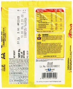 購買価格9.5ルピー(約16円)の安価な製品で、内容量は51.2g。ファニーなブランドのロゴからして子供を対象とした製品のようだ。なおYippeeは「わーい!」とか「やった〜!」「きゃー!」という興奮に伴う感嘆詞。外装の基調色は国民食であるMaggi 2 Minute Noodles Masalaに酷似した黄と赤。