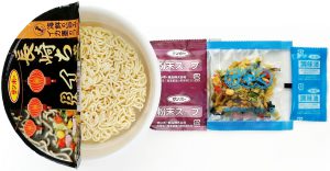 | 付属品 | 粉末スープ、かやく(キャベツ・きくらげ・コーン・かまぼこ・にんじん)、調味油 |