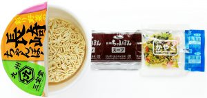 | 付属品 | 粉末スープ、かやく(キャベツ・きくらげ・コーン・かまぼこ・にんじん)、調味油 |