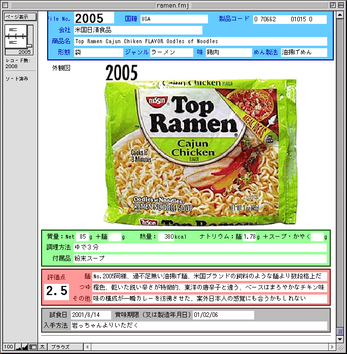 データを投入し始めてすぐにエクセルによる管理では写真や試食記文章の扱いに限度があることに気付き、まともなデータベースとしてファイルメーカーProを購入、試食記の内容を全て含む、本気の即席ラーメンDBを構築しました(99年10月に基本形を作る)。 以後「即席ラーメンDBの抜粋をインターネットで公開する」というスタイルが完成しました。 全ての製品の写真を取り込むには相当に長い時間を要しましたが。 ちなみに、01年8月にレトルトカレーもDB化が完了しました。