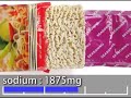 | スペック | ゆで3分、Net80/75g、383kcal(1604kJ)、ナトリウム0.3+1.4g | |||