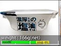 | スペック | 熱湯4分、Net91/60g、297kcal(1243kJ)、ナトリウム0.1+3.2g | |||