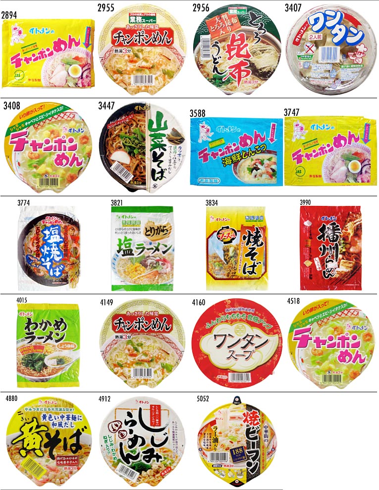 (2) No.2894('04-06)〜No. ジャンル 品名 2894 040613 イトメン 袋ラーメン イトメンのチャンポンめん 2955 040907 イトメン カップラーメン 業務スーパー チャンポン麺(販売:神戸物産) 2956 040908 イトメン カップラーメン 業務スーパー とろろ昆布うどん(販売:神戸物産) 3407 060723 イトメン 袋ワンタン ワンタン 2人前 3408 060725 イトメン カップラーメン チャンポンめん(カップ版) 3447 060913 カップそば 山菜そば 3588 070421 袋ラーメン チャンポンめん 海鮮とんこつ 3747 071125 袋ラーメン チャンポンめん 3774 080104 袋焼そば イトメンのチャンポンめん 塩焼そば 3821 080309 袋ラーメン とりがら 塩ラーメン 3834 080330 袋焼そば 焼そば こだわりのソース味 3990 081116 袋ラーメン 播州らーめん しょうゆ 4015 081221 袋ラーメン わかめラーメン しょうゆ味 4149 090708 カップラーメン チャンポンめん(販売:神戸物産) 4160 090723 カップワンタン ワンタンスープ(販売:神戸物産) 4518 101228 カップラーメン チャンポンめん(カップ) 4880 120612 カップラーメン 黄そば 4912 120726 カップラーメン しじみらーめん 5052 130213 カップビーフン 中華街の 焼ビーフン