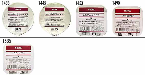 03-07/21 03-07/21改訂(1) No.1433('00-01)〜1535('00-01)No. ジャンル 品名 1433 000129 良品計画RD08 カップラーメン 無印良品 わかめ入しょうゆラーメン 1445 000117 良品計画RD08 カップラーメン 無印良品 コーン入みそラーメン 1453 000127 良品計画RS46 カップうどん 無印良品 ミニキムチうどん 1490 991225 良品計画RS46 カップ焼そば 無印良品 ミニ焼そば 1535 000127 良品計画RS46 カップうどん ミニうどん