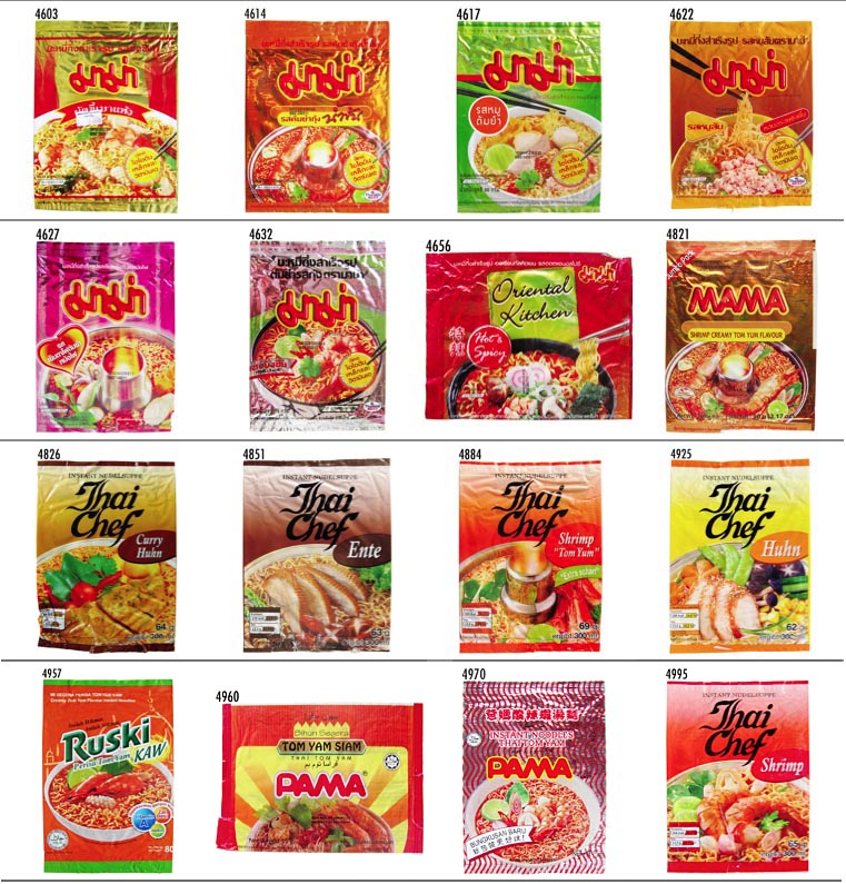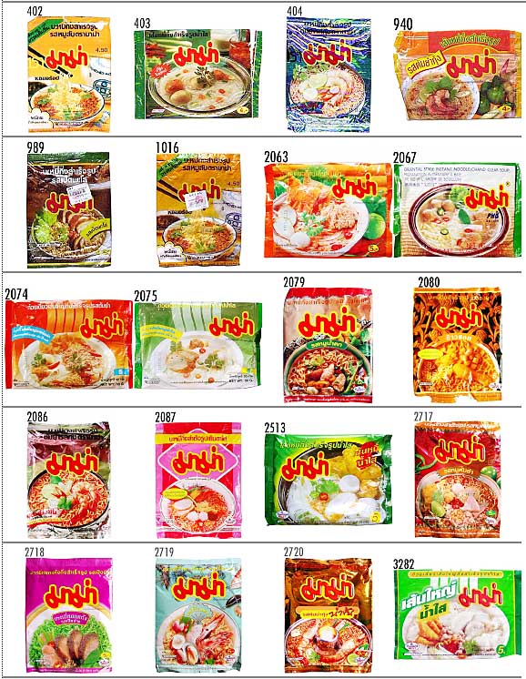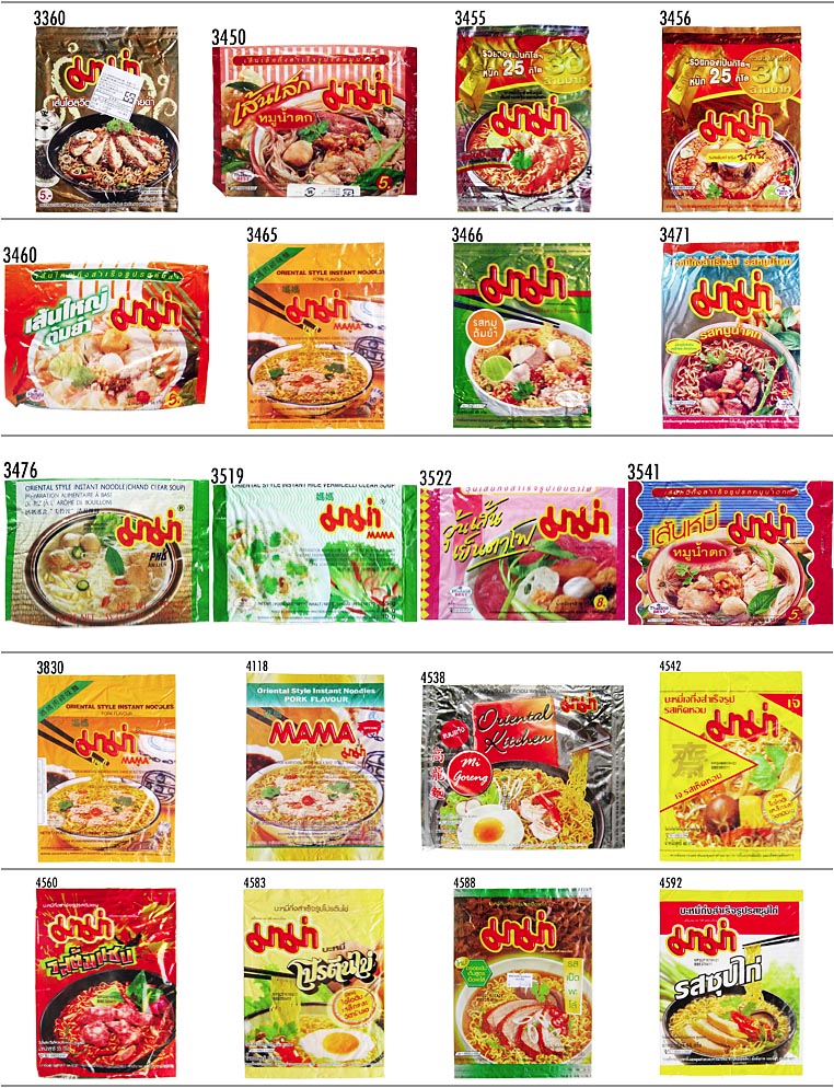 Thai President Foods / MAMA2 : No.3360('06-05) 〜 ▲No. 年月日 メーカ/販売者 ジャンル 品名 3360 060520 袋ラーメン MAMA Instant Noodles Pork Flavour with Black Pepper 3450 060917 袋ビーフン MAMA Sen Lek Moo Nam Tok 3455 060923 袋ラーメン MAMA Instant Noodles Shrimp Tom Yum Flavour 3456 060924 袋ラーメン MAMA Instant Noodles Shrimp Creamy Tom Yum Flavour 3460 060930 袋ビーフン MAMA Instant Flat Noodles Sen Yai Tom Yum 3465 061007 袋ラーメン MAMA Instant Noodles Moo Sub (Oil Sachet) 3466 061008 袋ラーメン MAMA Instant Noodles Tom Yum Pork Flavour 3471 061014 袋ラーメン MAMA Instant Noodles Moo Nam Tok Flavour 3476 061021 袋フォー MAMA Sen Lek Nam Sai (Chand Clear Soup) 3519 061230 袋ラーメン MAMA Sen Mee Nam Sai 3522 070107 袋ラーメン MAMA Wunsen Yentafo 3541 070203 袋ビーフン MAMA Sen Mee Moo Nam Tok 3830 080322 袋ラーメン MAMA Moo Sub (Oli Sachet) Pork Flavour 4118 090523 袋ラーメン MAMA Moo Sub (Oil Sachet) 4538 110130 袋汁無し麺 MAMA Oriental Kitchen, Mi Goreng 高龍麺 4542 110205 袋ラーメン MAMA Vegetarian Instant Noodles Shiitake Flavour 4560 110305 袋ラーメン MAMA Instant Noodles / Tom Saab Flavour 4583 110410 袋ラーメン MAMA Egg Noodle 4588 110417 袋ラーメン MAMA Instant Noodles PA-Lo Duck Flavour 4592 110426 袋ラーメン MAMA Instant Noodles Chicken Soup Flavour