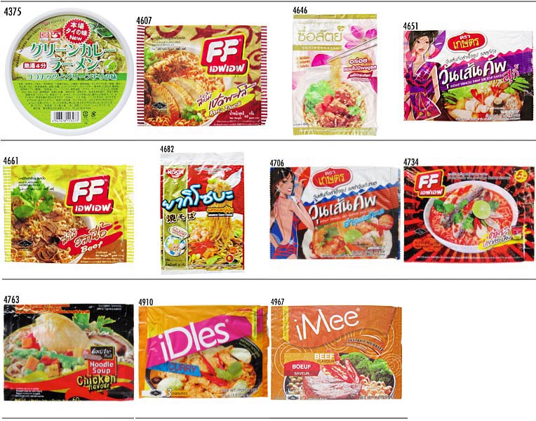 Namchow / Littlt Cook ▲No. 年月日 メーカ/販売者 ジャンル 品名 4171 090808 袋ラーメン Little Cook Instant Noodle / Oriental 4181 090822 袋ラーメン Little Cook Instant Noodle / Beef 4205 090924 袋ラーメン Little Cook Instant Noodle / Chicken 4232 091101 袋ラーメン Littlt Cook Instant Noodle / Mushroom 4269 091223 袋ラーメン Little Cook Instant Noodle / Vegetable 4318 100307 袋ラーメン Little Cool Instant Noodle / Shrimp